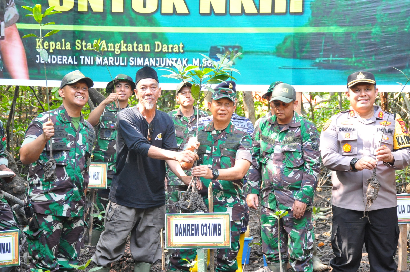 Danrem 031/WB Brigjen TNI Dany Rakca S.A.P., M.Han mengatakan "Kami keluarga besar Korem 031/WB bersama unsur Forkopimda dan penggiat Kelesatarian Alam Bakau mengucapkan selamat ulang Tahun kepada Bapak KASAD ke 54 Tahuh".