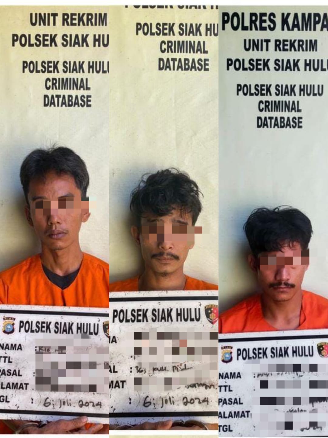 Ketiga pelaku adalah AL (23), AN (22) keduanya warga Simpang Beringin, Kabupaten Pelalawan dan RI (43) warga Desa Pangkalan Baru, Kecamatan Siak Hulu.