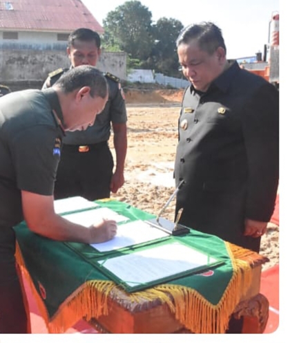 Pekanbaru- Komandan Korem 031/Wira Bima Brigjen TNI Dany Rakca, S.A.P., M. HAN., bersama Pj gubri menggelar peletakan batu pertama sebagai pertanda dimulainya pembangunan rumah sakit tentara yang menggunakan APBD Riau tahun 2024, Kamis (18/7/24)