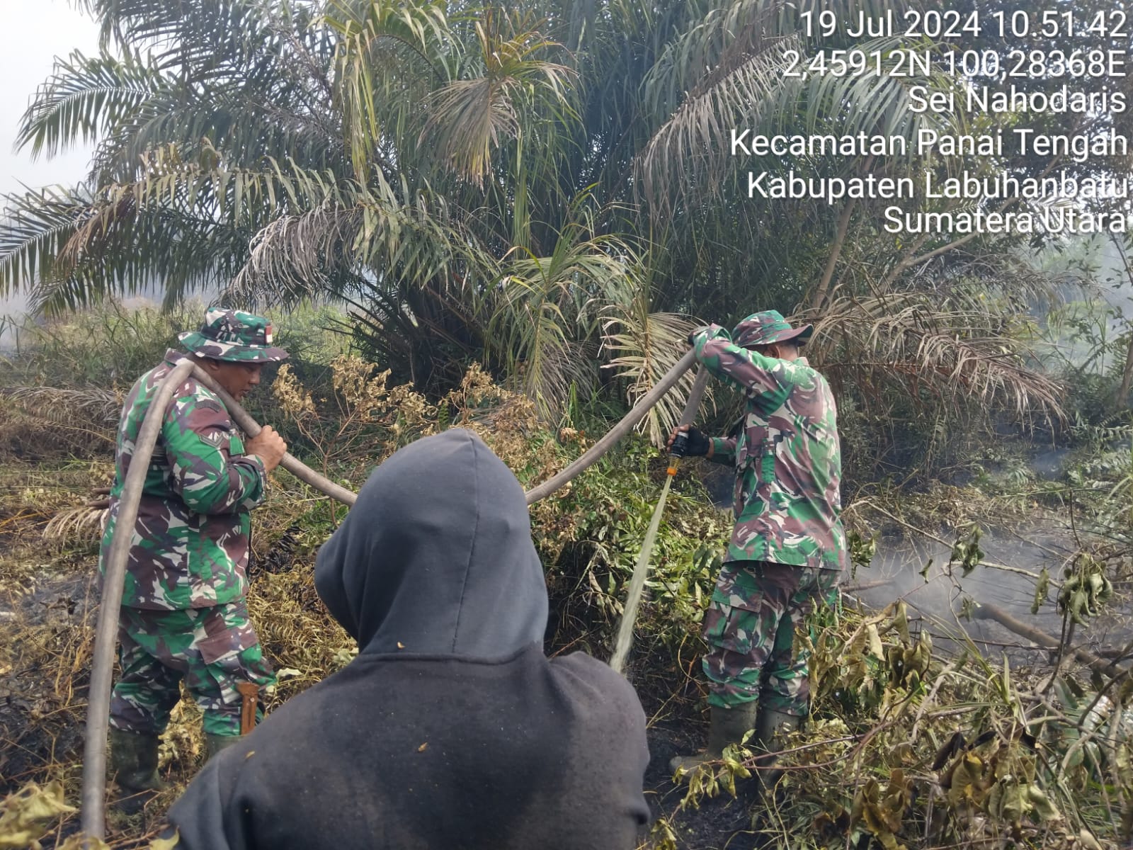 Rohil - Menindaklanjuti terpantaunya titik panas melalui aplikasi Dasboard Lancang Kuning di beberapa wilayah di Kab. Rohil, personel Koramil jajaran Kodim 0321/Rohil bersinergi dengan tim gabungan dari Kepolisian, Masyarakat Peduli Api (MPA), Manggala Agni dan juga warga masyarakat langsung melakukan verifikasi dilapangan. Jumat (19/07/2024)
