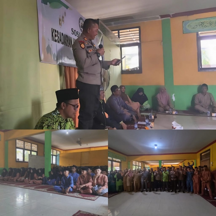 Pulai Kijang - Kapolsek Reteh AKP Herman, S.H didamping PS Kanit Reskrim BRIPKA DEDY CHANDRA, S.H dan Banit Samapta BRIPDA GABRIEL ROTUA TOBING menghadiri kegiatan Sosialisasi Kesadaran Hukum pada Anak Usia Remaja di Madrasah DDI Pulau Kijang Kec. Reteh. Jum'at, 20/09/24.