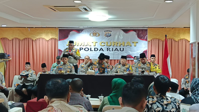 Pekanbaru, Polda Riau rutin menggelar Program Jumat Curhat guna meningkatkan silaturahmi kepada masyarakat yang ada di Kota Pekanbaru, hari ini kegiatan tersebut berlangsung di salah satu hotel yang ada di Kecamatan Lima Puluh Kota Pekanbaru yang berada di Jl. Sisingamangaraja Kota Pekanbaru, diketahui bahwa, kegiatan Jum'at Curhat tersebut bertujuan untuk mempererat hubungan antara polisi dan masyarakat dalam menjaga keamanan dan ketertiban di lingkungan sekitar.