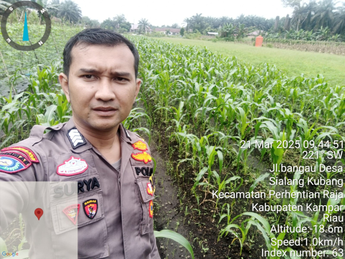 Perhentian Raja, - Bhabinkamtibmas Polsek Perhentian Raja, Bripka Suryatman Akbar, SH, terus aktif mendukung program prioritas Asta Cita yang diterapkan oleh Kapolri. Pada Jumat (21/03/2025) sekira jam 11.00 WIB, Bripka Suryatman melakukan sambang dan pengecekan ketahanan pangan di Desa Sialang Kubang, Kecamatan Perhentian Raja.