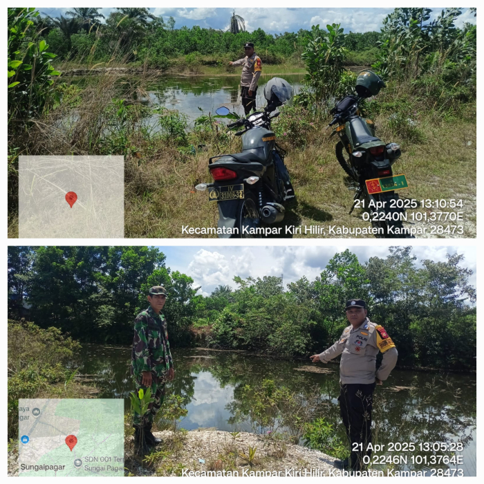 Kampar Kiri Hilir, - Bhabinkamtibmas Kelurahan Sungai Pagar, Bripka Zamroni Daulay, bersama Danpos Ramil Kecamatan Kampar Kiri Hilir, Peltu Rudi M. Tanjung, terus berupaya mencegah terjadinya kebakaran hutan dan lahan (karhutla) di wilayahnya. Pada Senin (20/04/2025) sekira pukul 13.00 WIB, Bripka Zamroni melakukan pengecekan embung di dua lokasi di Kelurahan Sungai Pagar serta menjalin sambang dengan warga dan mensosialisasikan tentang larangan membakar hutan dan lahan.