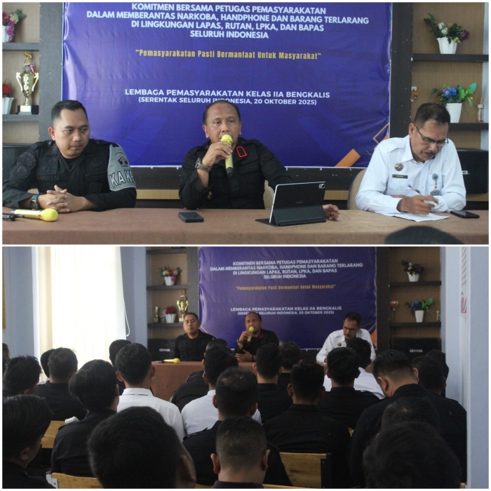 Bengkalis - Kepala Lembaga Pemasyarakatan (Kalapas) Kelas IIA Bengkalis, Priyo Tri Laksono, memimpin langsung kegiatan penguatan tugas dan fungsi pengamanan yang dilaksanakan di Aula Lapas Bengkalis, Kamis (06/11/2025).