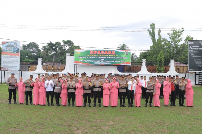 KAMPAR - Polres Kampar menggelar upacara laporan kenaikan pangkat personel Polres Kampar periode 1 Januari 2026, Selasa (30/12/2025) pukul 07.00 WIB di lapangan hijau Mapolres Kampar.